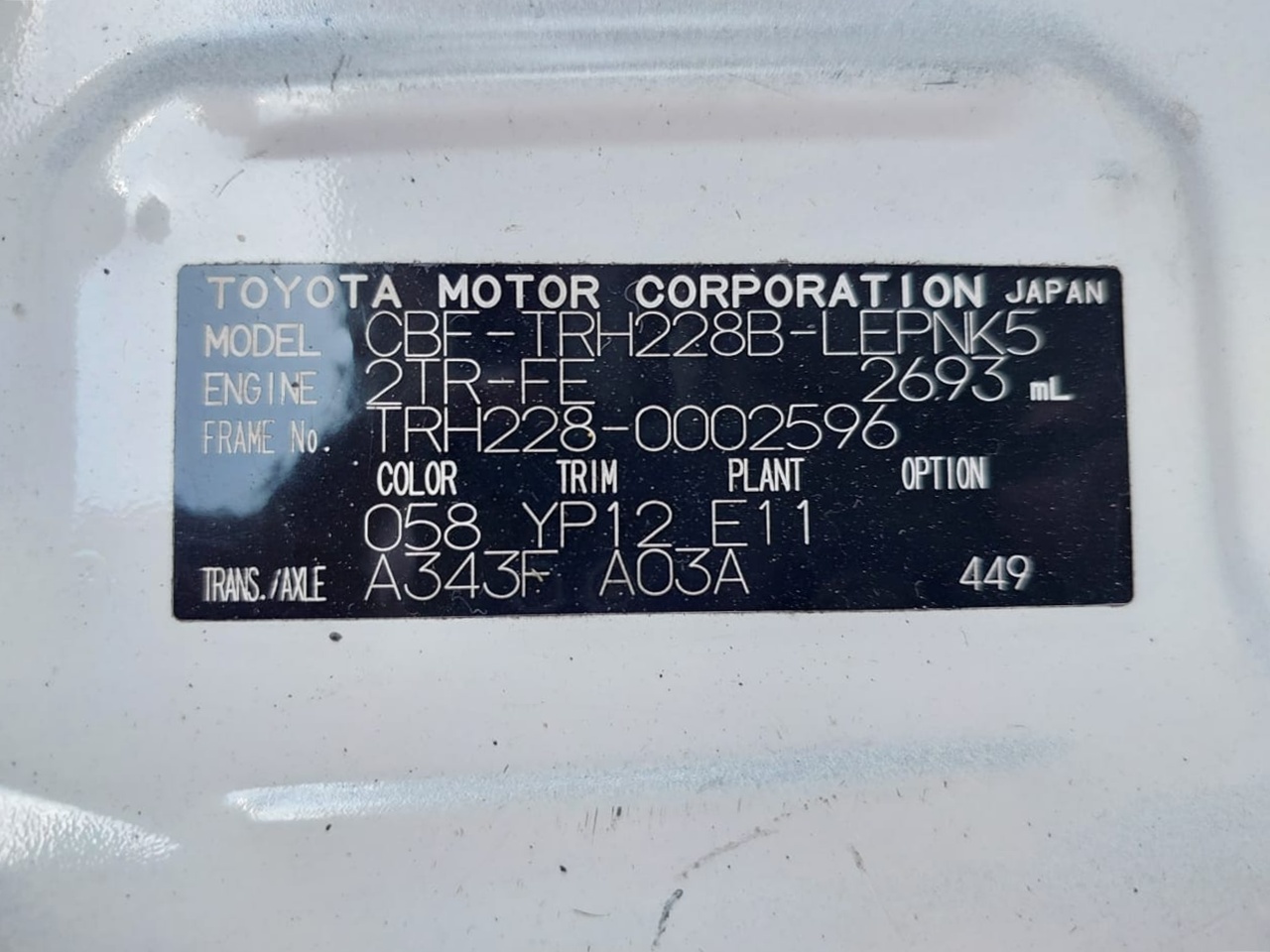 Chassis No. | TRH228-0002596 |
