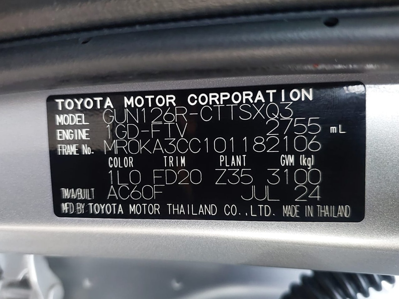 | Chassis No. | MR0KA3CC101182106 |