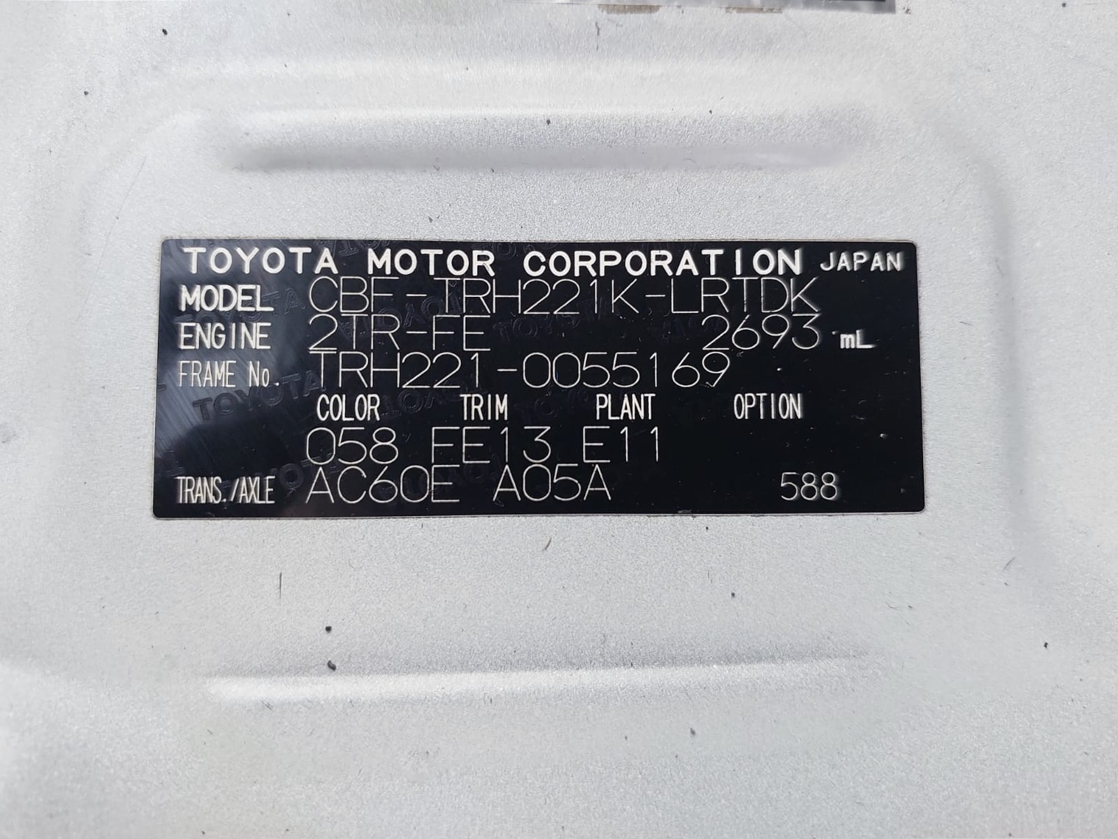 | Chassis No. | TRH221-0055169 |