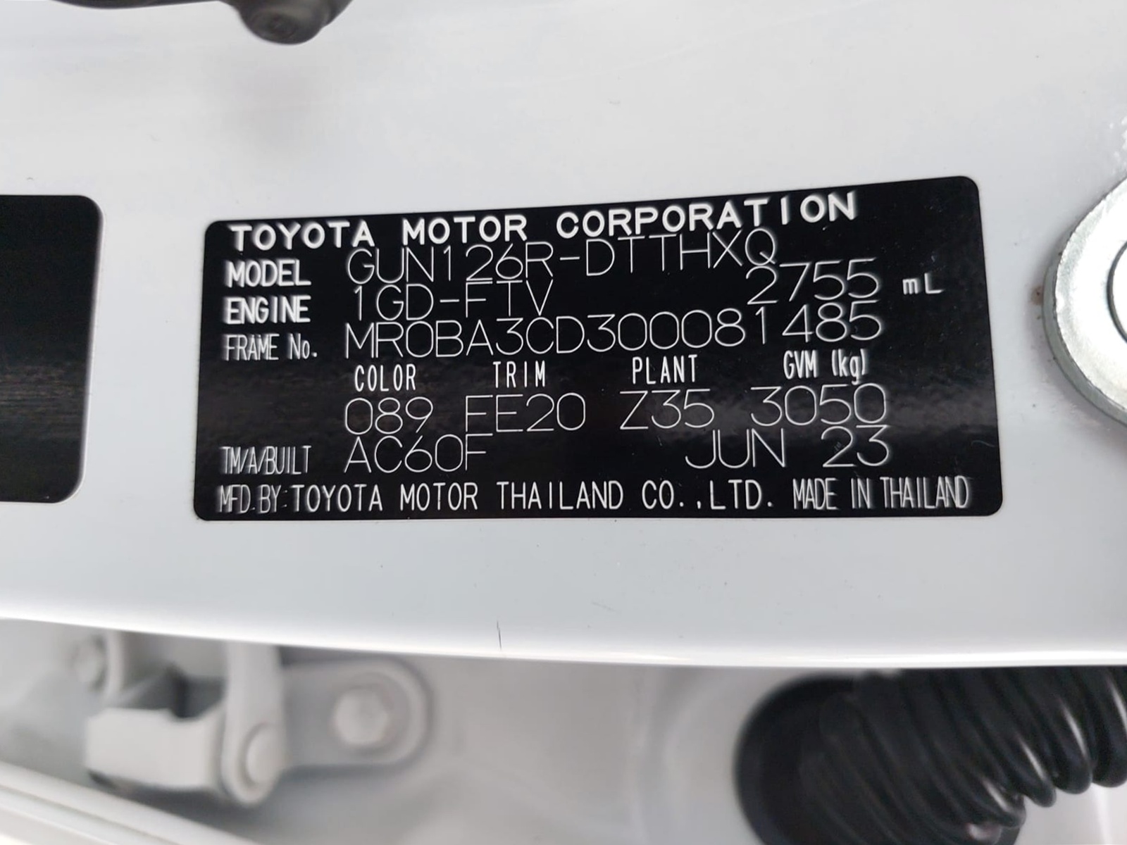 | Chassis No. | MR0BA3CD300081485 |