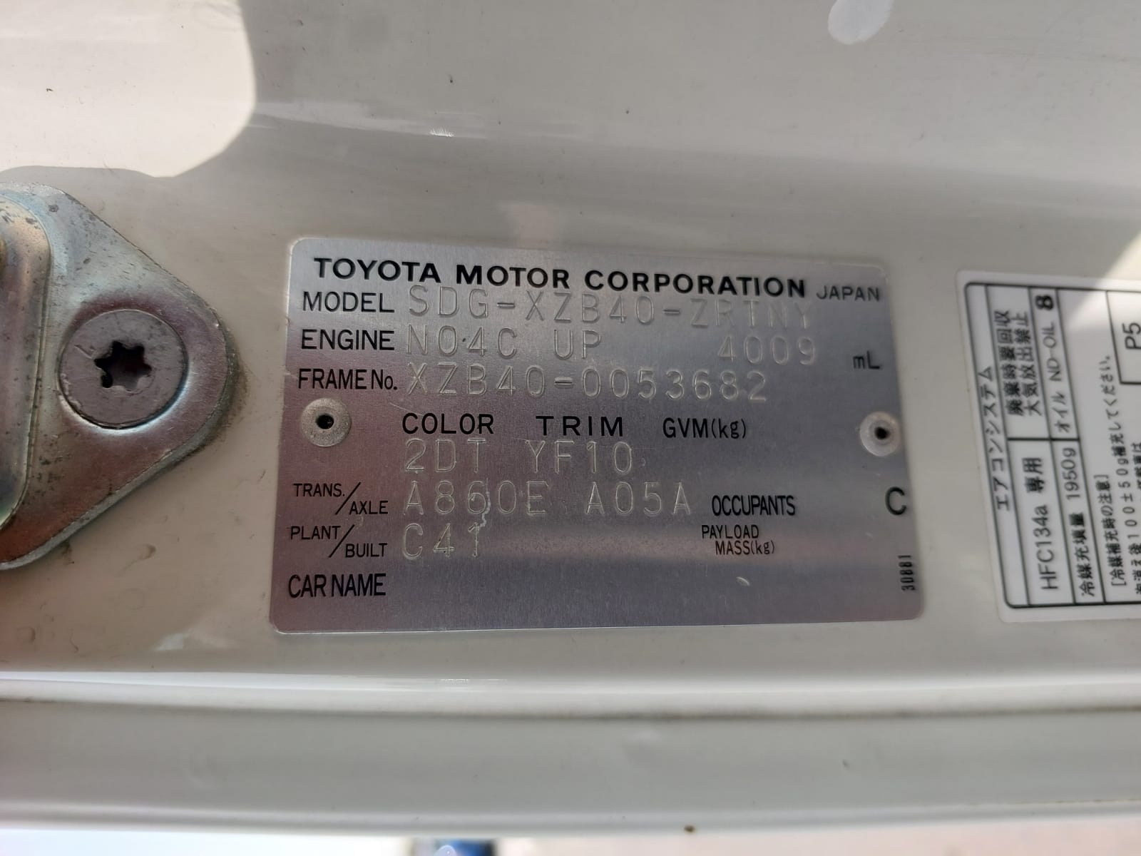 | Chassis No. | XZB40-0053682 |
