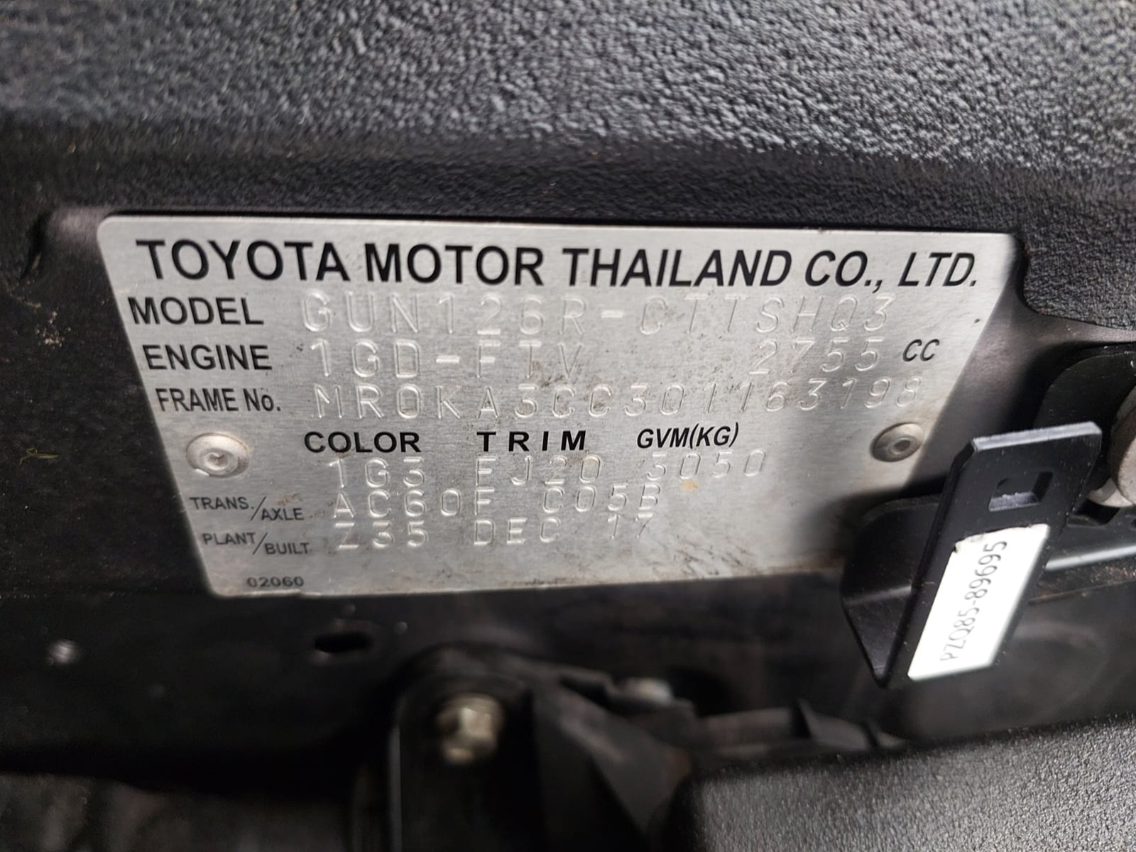 | Chassis No. | MR0KA3CC301163198 |